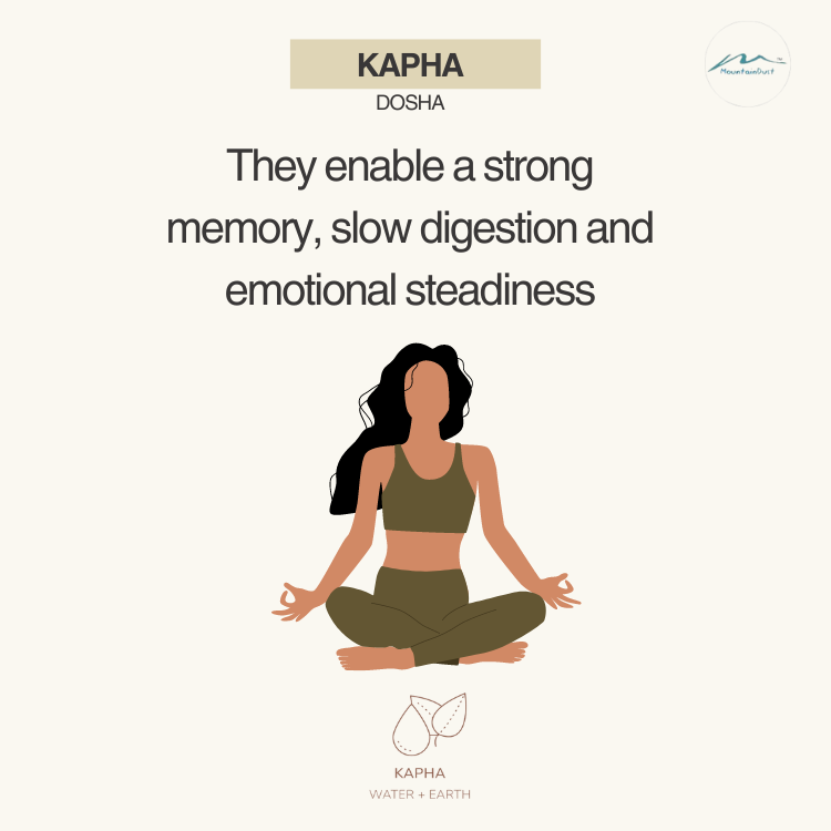 Kapha dosha provides body structure and smooth functioning, located in the chest, throat, lungs, head, and tissues. It aids in joint lubrication and energy storage. Kapha individuals are loving, relaxed, compassionate, and financially savvy, often holding on to people and things for a long time.